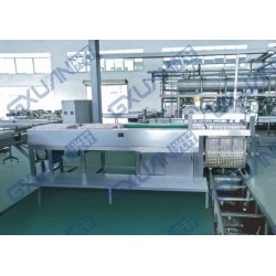 裝籠機/卸籠機主要應用于對各種罐裝飲料或罐頭等在二次殺菌前進行自動裝籠作業。通過網鏈收罐平臺及分罐裝置將完成灌裝封口后的實罐由下而上一層一層自動裝疊于殺菌籠(籃)里,再通過電動臺車循環軌道輸送系統傳送至殺菌鍋進行殺菌,整個裝籠過程隔層板自動釋出、自動上升,自動分罐、裝罐,自動下降、滿籠自動停止裝罐,取代人工裝籠方式,節省人力,大大提高生產效率。