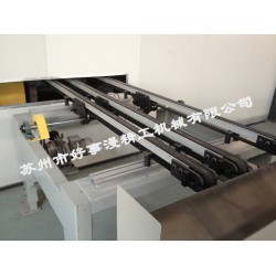 強化地板開槽銑形生產線由五個主要部分構成:一部分:縱向前端自動進料裝置(前進料輥臺);二部分:縱向單軌雙開雙端銑;三部分:中間自動連接裝置(中間送料輥臺);四部分:橫向雙端銑; 五部分:自動翻板線。