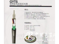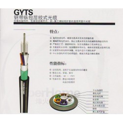 鋼帶縱包層絞式光纜(GYTS) 金屬加強構件、松套層絞填充式、鋼-聚乙烯粘結護套的通信用室外光纜 特點:·全截面阻水結構,雙面覆膜鋼帶縱包,確保良好的阻水防潮性能·松套管內填充特種油膏,對光纖進行關鍵性保護·磷化鋼絲中心加強構件模量高、耐腐蝕·產品使用壽命30年以上性能指標:·應用范圍:適用于長途通信和局間通信·敷設方式:架空、管道·工作溫度:-40~+70℃·彎曲半徑:靜態10倍纜徑 動態20倍纜徑