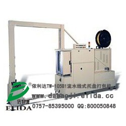 依利達TW-105B1流水線式托盤穿劍式打包機(又稱為廣州在線式全自動棧板捆扎機/深圳卡板自動輸送捆包機/東莞托盤在線式捆扎打帶機/惠州棧板無人化打包帶包裝機械/佛山全自動在線棧板捆包機/珠海側邊冰箱捆扎機):針對棧板捆包而設計,實現無人化棧板自動打包;