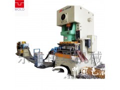 電動放料架→31輥伺服一次校平機→油壓機沖定位孔→高速油壓機沖排孔→數控送料機→油壓機沖角切斷→單板二次校平機→輸送帶→機械手→定位模具→機械手→拉伸成型→輸送帶→成品。