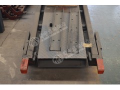 礦用搖臺為一段可擺動軌道,一端繞固定軸擺動,另一端當(dāng)罐籠停好后搖尖搭接在罐籠邊緣的導(dǎo)軌襯上, 搖臺邊接了罐內(nèi)與車場中的軌道, 礦用搖臺便于礦車進(jìn)出罐籠.當(dāng)搖臺抬起時(shí),CYS-6/1.5礦用搖臺上突出部的外形與罐籠間留有足夠的安全間隙.搖尖的前端,工作時(shí)與罐內(nèi)導(dǎo)軌襯搭接,搖尖鉸接在搖臂上,可以自由轉(zhuǎn)動合適的角度,搖尖的尾部設(shè)有配重,使其前部經(jīng)常處于抬起狀態(tài).當(dāng)由于事故搖臺放下后,罐籠通過時(shí),搖尖頭部被撞向下旋轉(zhuǎn),而允許罐籠安全通過.搖尖和導(dǎo)軌襯的結(jié)構(gòu)*保*了搖臺與罐籠搭接時(shí),側(cè)向能可靠定位,從而罐籠內(nèi)外軌道不會錯位,避免發(fā)生礦車掉道事故。