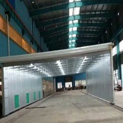 整體移動(dòng)式噴漆房的設(shè)計(jì)目的,是為了較大型工件打磨或噴漆的需要。一般情況下每套房體對應(yīng)2-3個(gè)排風(fēng)凈化工位,哪個(gè)工位上的工件需要噴漆時(shí),房體則行走移動(dòng)到那個(gè)工位,其他工位可以繼續(xù)打磨工作,待房體內(nèi)的工件噴漆完畢后,再控制移動(dòng)房體行走到打磨完畢的工件工位,如此設(shè)計(jì)可以實(shí)現(xiàn)大型工件的不間斷連續(xù)噴漆工作。房體為鋼結(jié)構(gòu)構(gòu)造,房體立柱設(shè)置有兩臺電動(dòng)驅(qū)動(dòng)行走機(jī)構(gòu),行走機(jī)構(gòu)沿地面軌道行走。移動(dòng)房體兩端設(shè)置有電動(dòng)卷簾大門,房體行走時(shí),大門升起,待到達(dá)位置時(shí),大門降落關(guān)閉。大門與行走機(jī)構(gòu)由電氣控制部分連鎖控制,大門升起后,房體才可移動(dòng)行走。